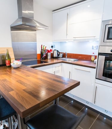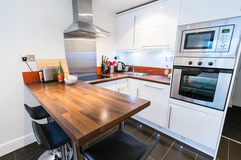 The kitchen is small but (probably) contains everything you need. The breakfast bar is the perfect place for casual nibbles and hearty meals. And once you’re done, the dishwasher can take care of the hard work.